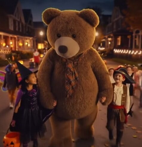 A cozy Halloween night in a small town. A giant friendly teddy bear walks with children in costumes, holding hands and laughing. Jack-o’-lanterns light the streets. The camera gently follows them from behind. Cinematic lighting, warm atmosphere, hyper-realistic live-action look.